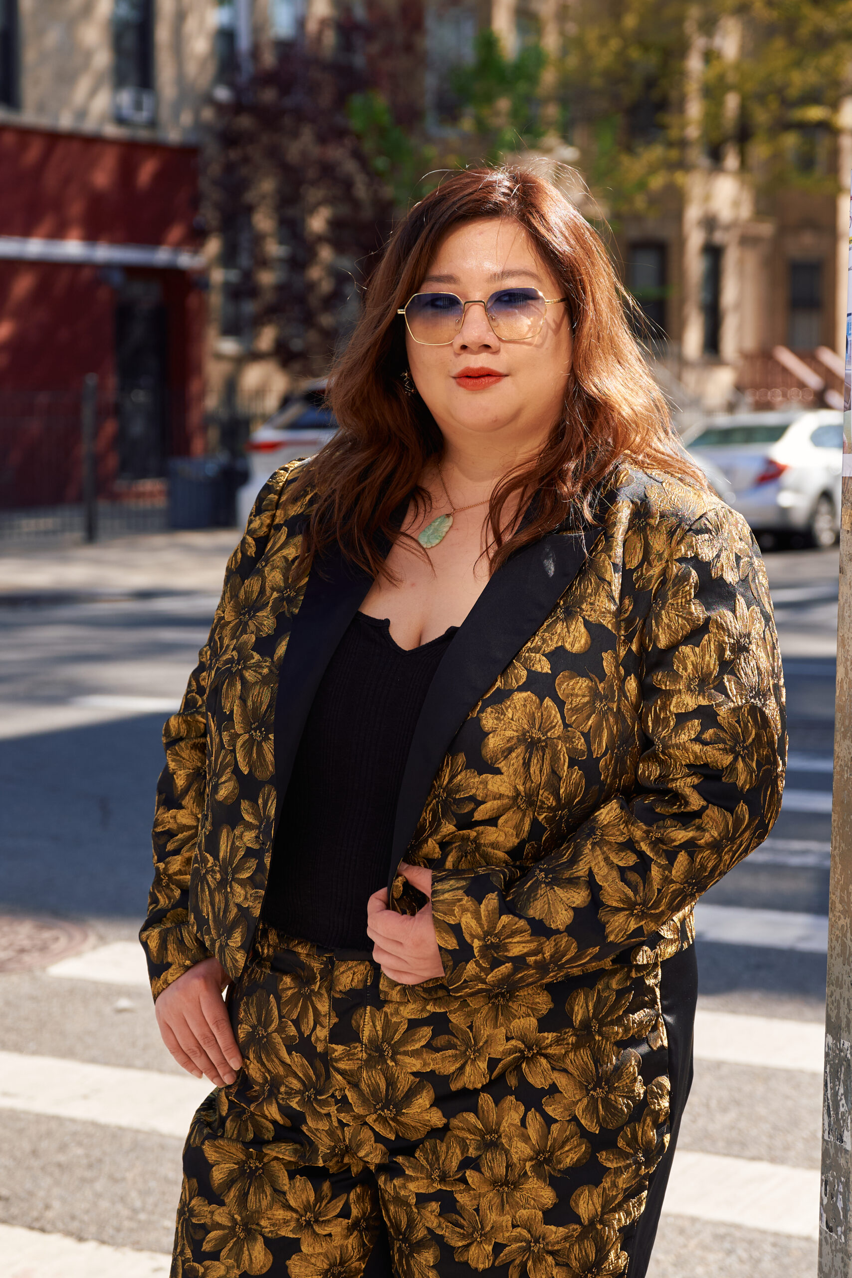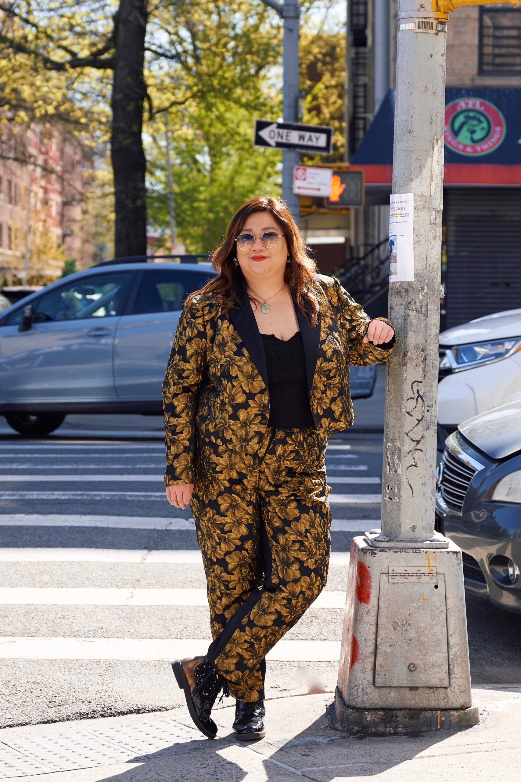 Suit: Eloquii, pants and jacket. Shoes: Embassy London. Sunglasses: Free People, similar. Jade pendant: family heirloom.