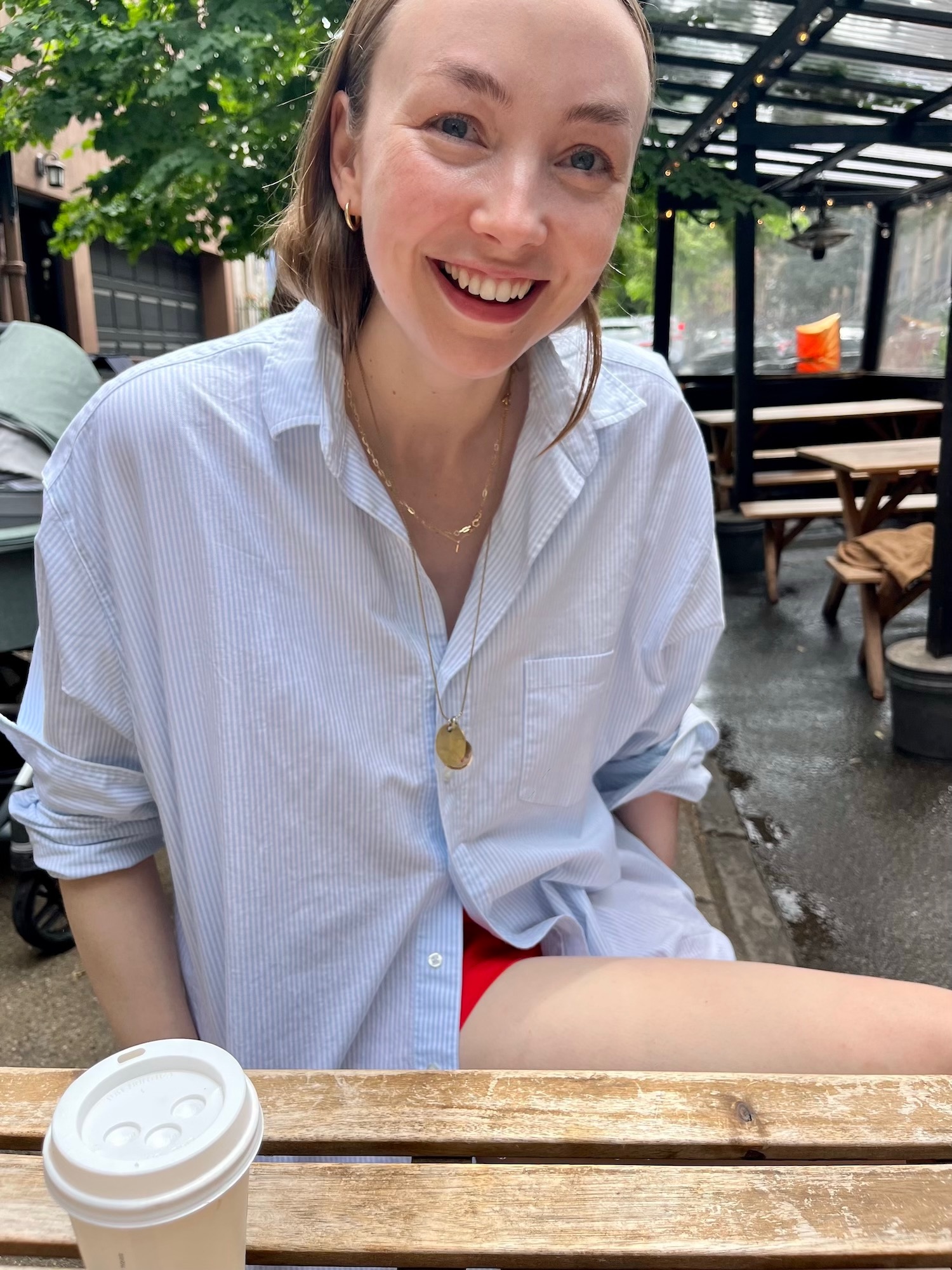 The other morning, I had coffee with my friend Erika Veurink, who writes the newsletter Long Live and runs a funny Instagram. She was wearing a blue-and-white striped shirt over red shorts with gold necklaces, and I loved all of it.