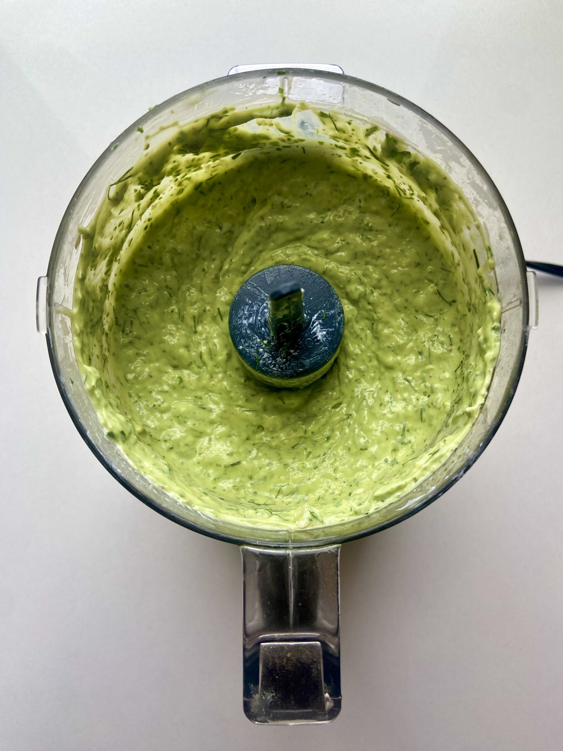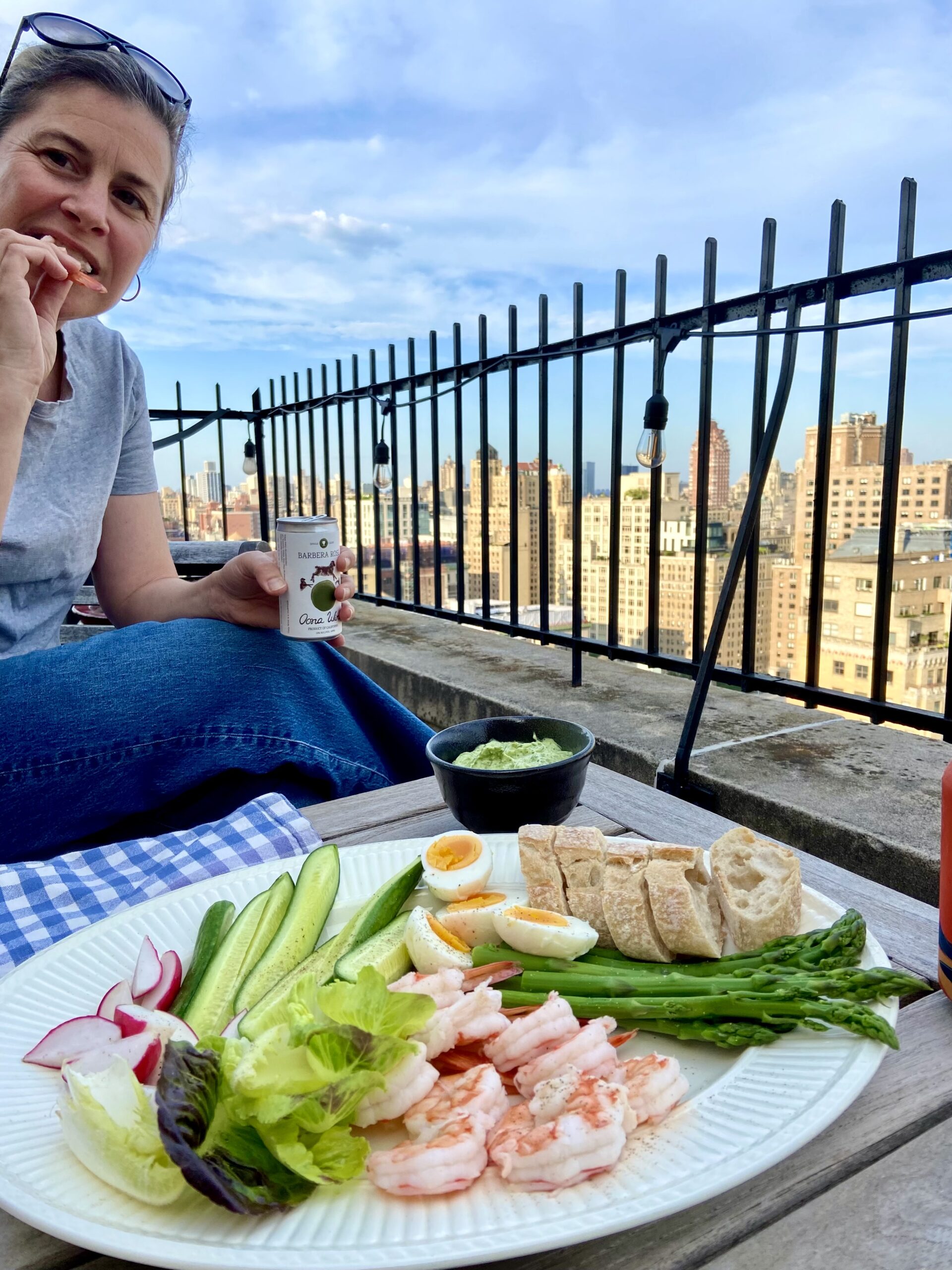 Anyway, I’m not complaining, I swear! Especially since I still eat outside — our apartment building has a pretty great roof deck and we take advantage of it as often as possible, enjoying a Friday night cocktail or a Saturday morning coffee alongside our dramatic view up the Hudson River and across Central Park. Dinner has proven trickier, though. Since an elevator and a narrow stairwell is involved, I have to be more strategic about what meals we eat there, and how many utensils and platters and plates and stuff is required. So far I’ve discovered two dinners that work: 1) Takeout and 2) what I’ve been calling my Grand Green Goddess Platter, which is like a Grand Aioli Platter but, you know, with Green Goddess dip instead of the garlicky mayo.