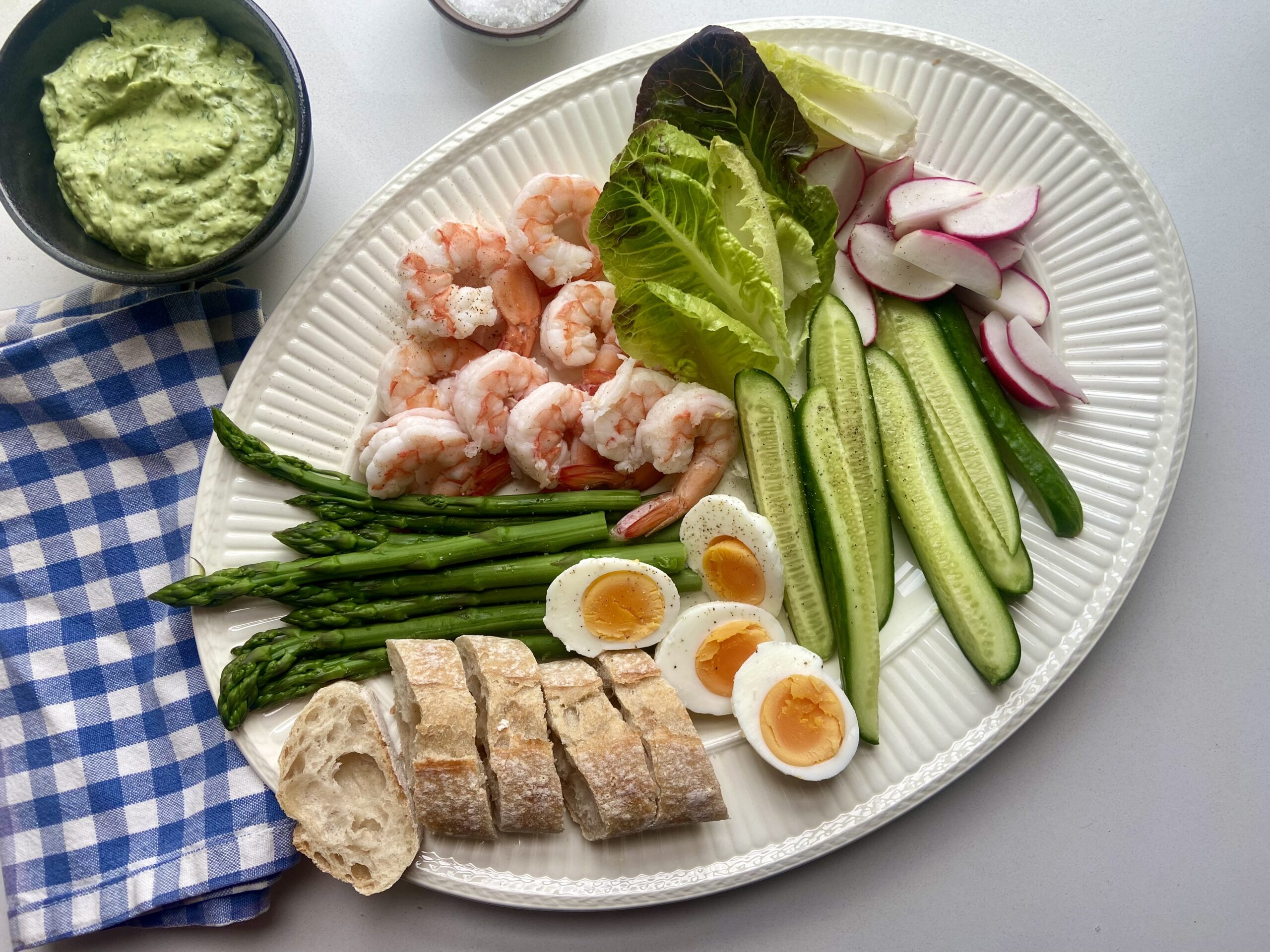 The meal is basically a crudité platter, assembled from whatever vegetables I have in the fridge, plus hard-boiled eggs and cooked shrimp if I’m feeling ambitious. None of it requires utensils or dinner plates (crucial), and all of it can be served at room temperature, which means it’s the kind of meal or starter platter that anyone — not just an empty-nesting recent city transplant — would love to have in the summer rotation. Here’s how to assemble it…