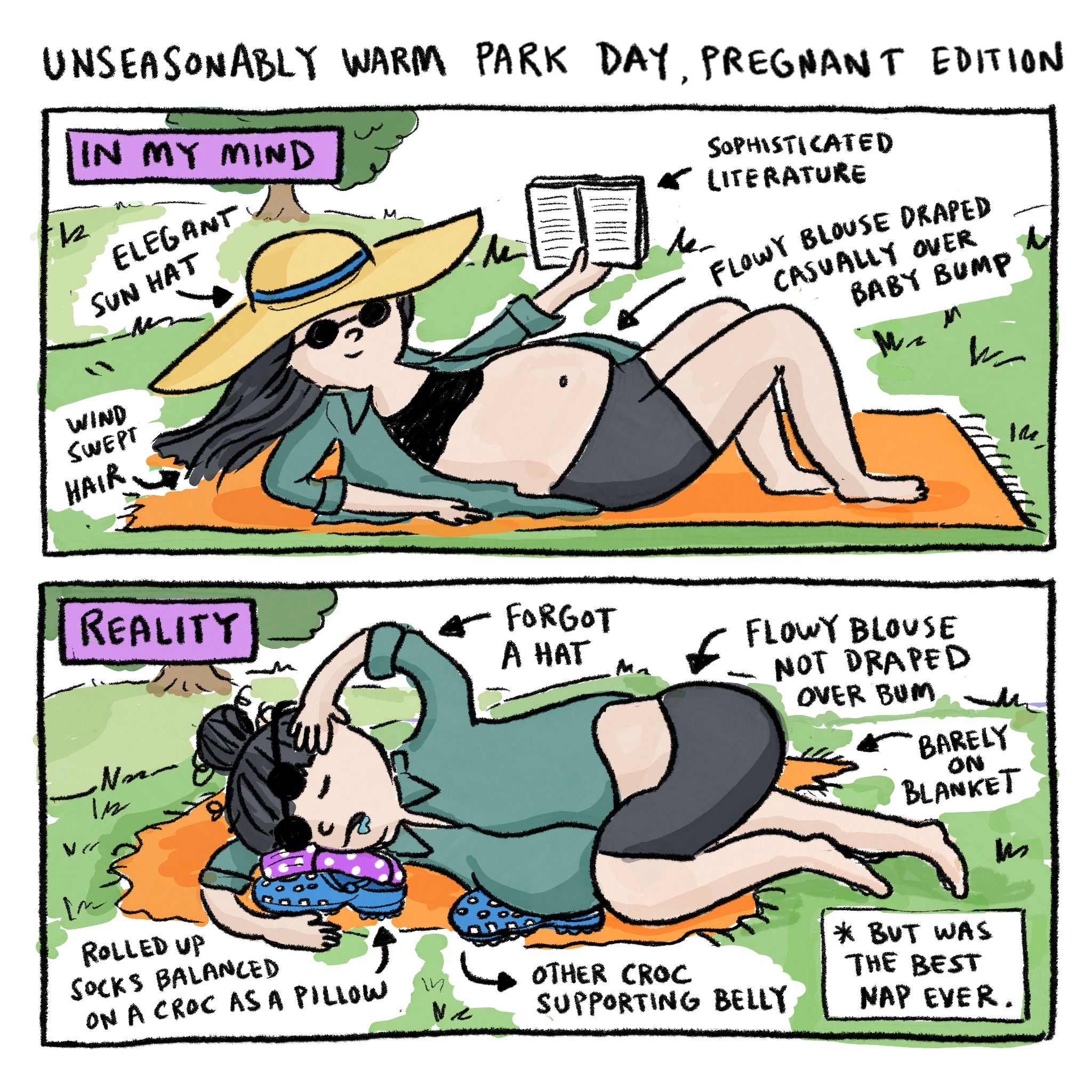 Not pregnant – I like to go to our botanical gardens with a book and intentions like the first sketch, and somehow it always turns into the second one. But who can resist a hard nap in the dappled sun??