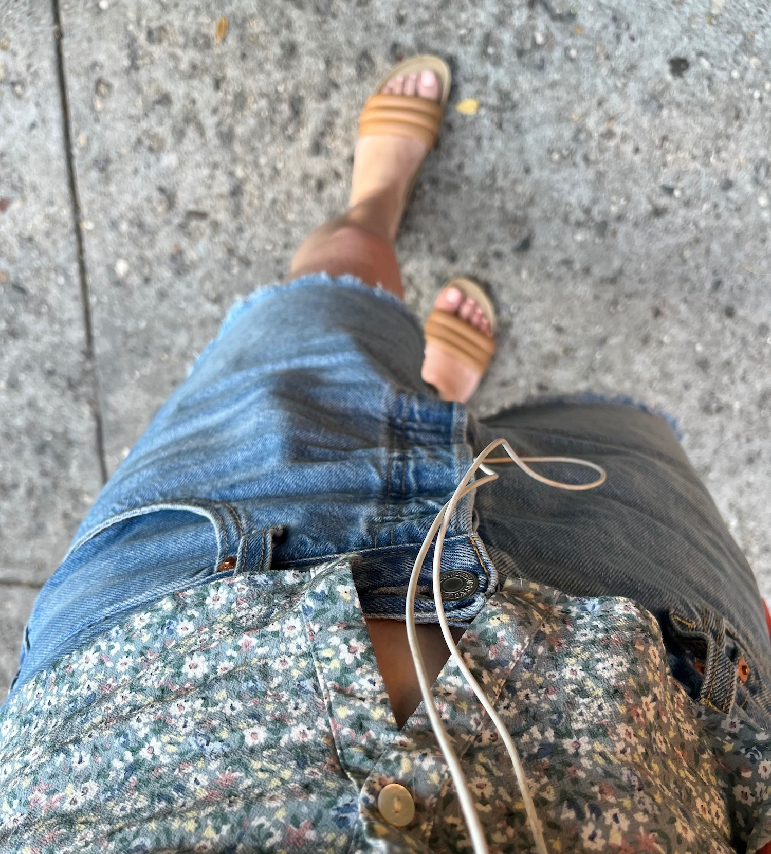 And at the top of this post — on an evening walk — I was wearing a Levi’s jean skirt I’ve had for a decade (!), an old floral shirt, and brown sandals from Poshmark.