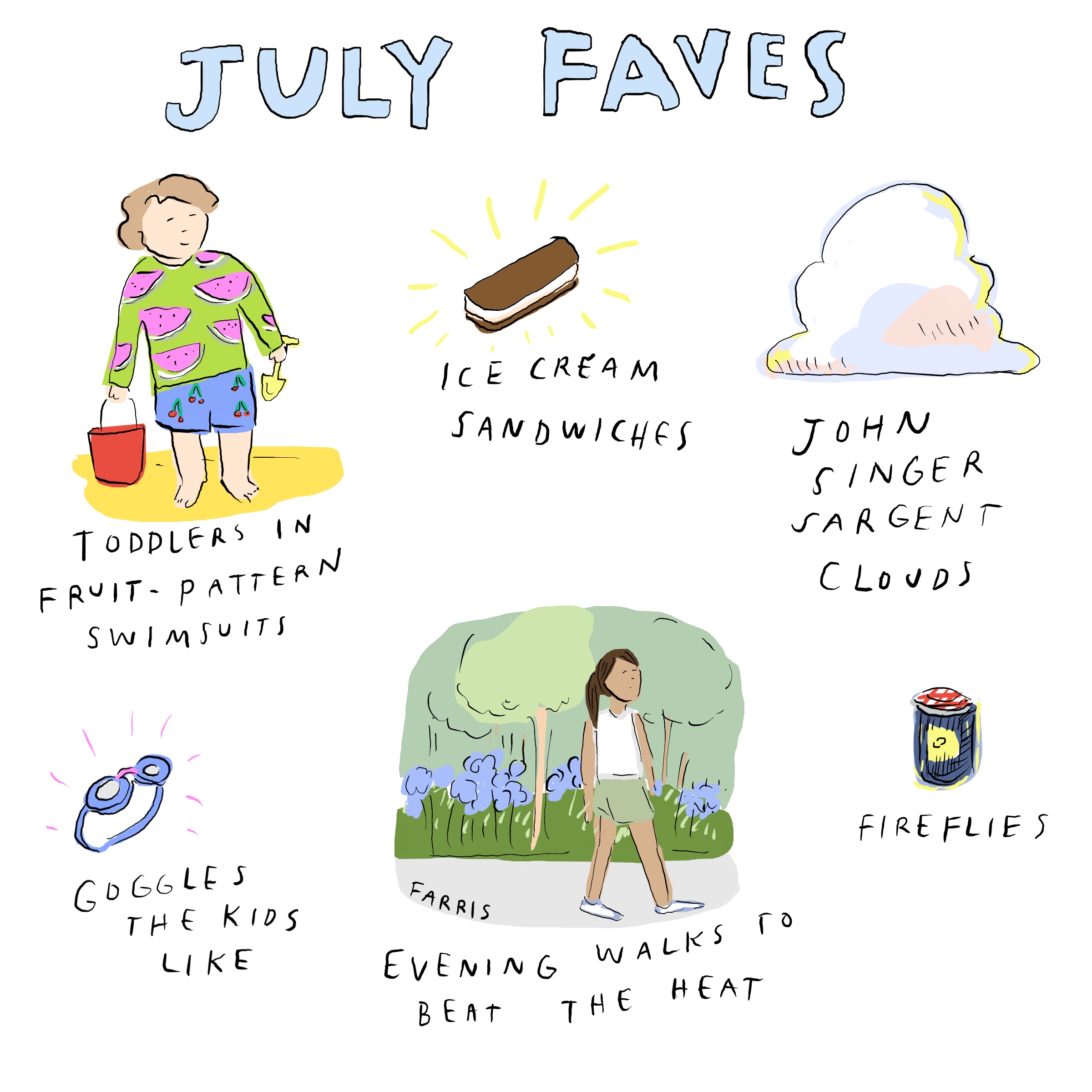 Ice cream cones and fireflies! BUT I’m in the southern plains, and our fireflies were done in June. (I never see any after July 1.) I envy anybody who has them all summer. July does bring looonnng, dramatic sunsets, though, and it’s prime blooming season for the crape myrtles, so there’s that.