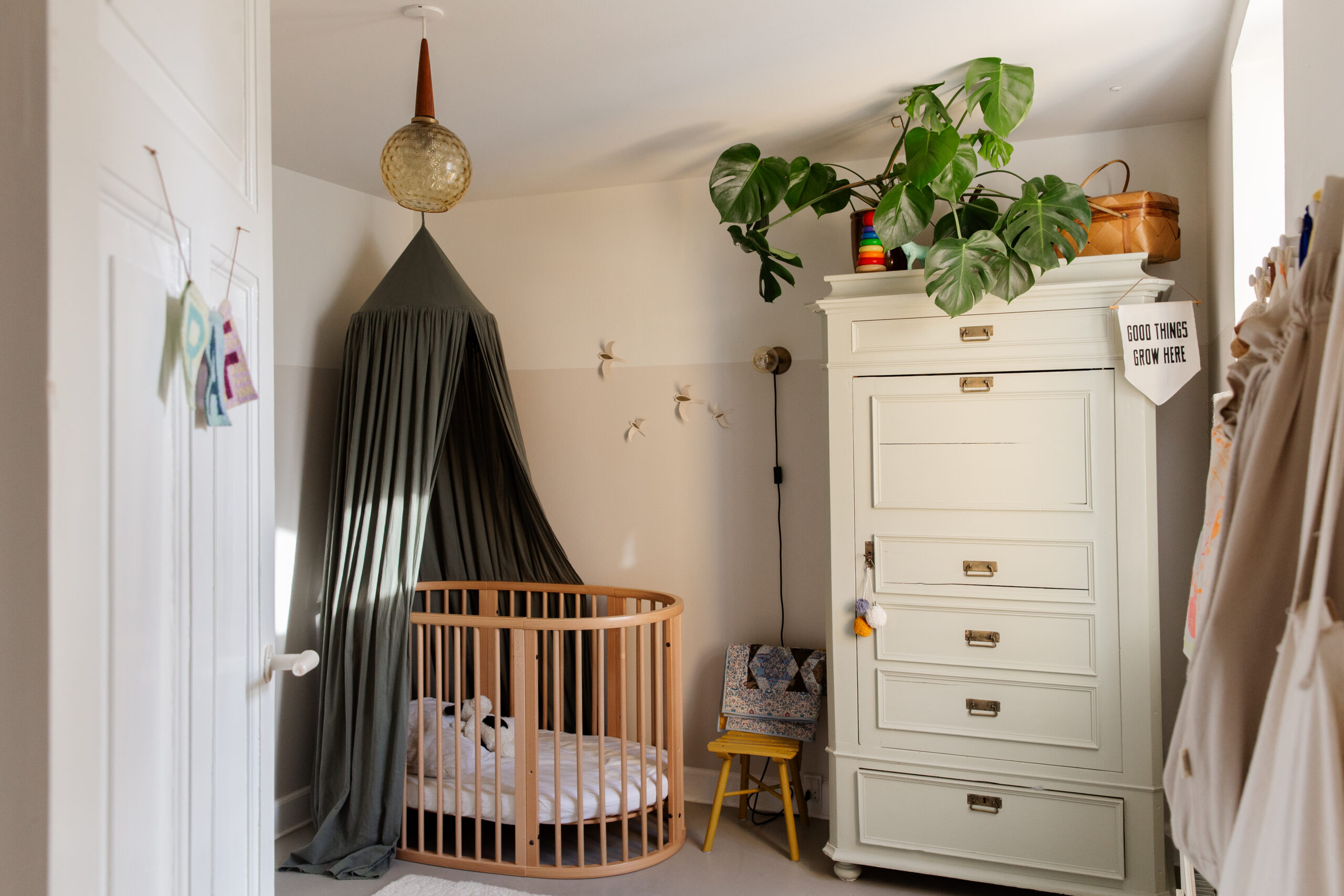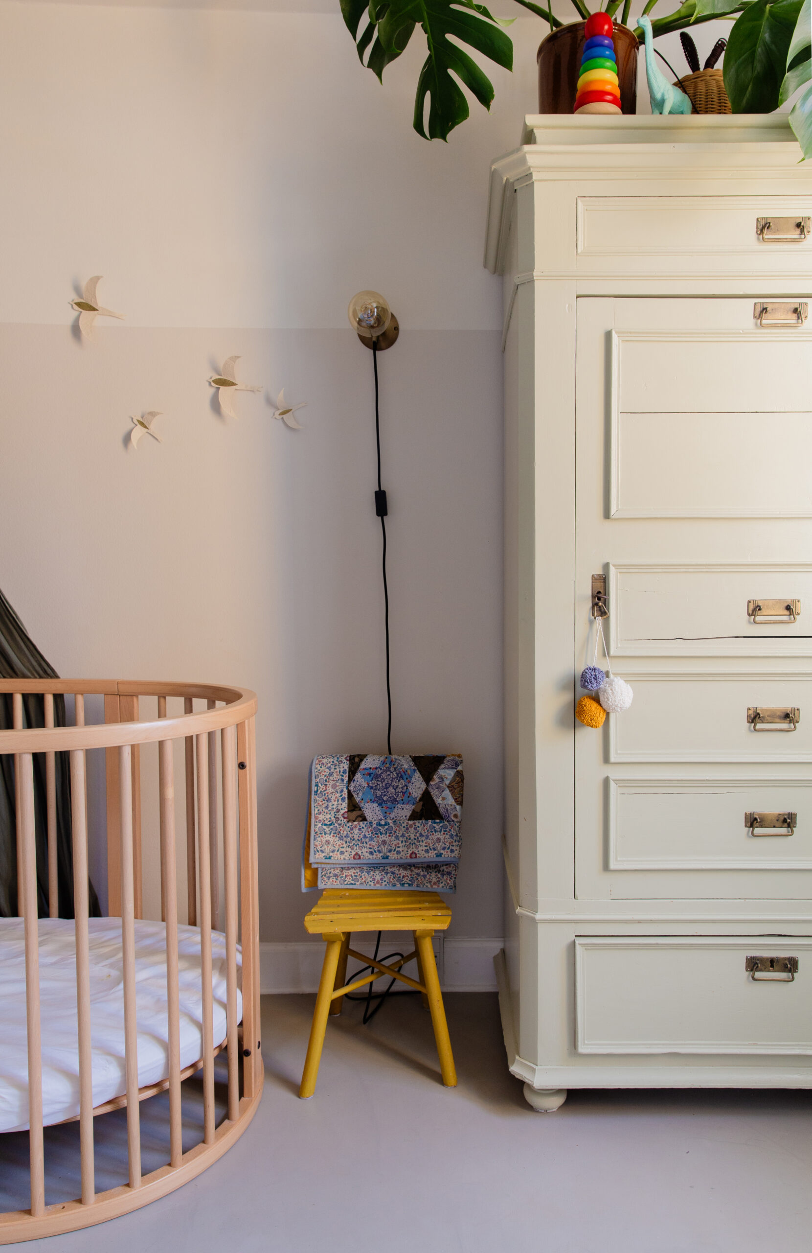 Crib: StokkeBaby. Dresser: Oliver Furniture.