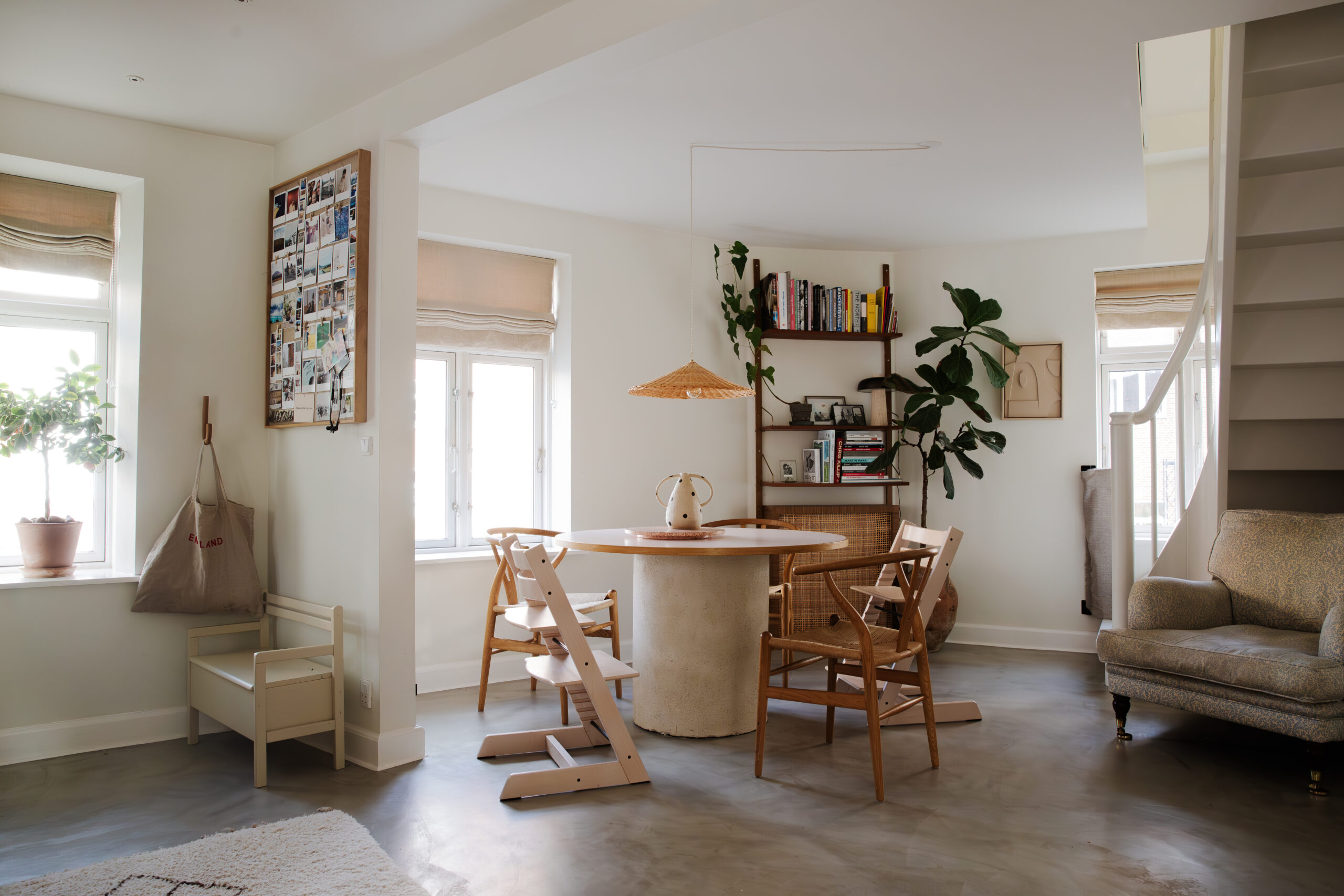 (photo above) Dining table: handmade, similar. High chairs: Stokke. Chairs: Hans Wegner. Pendant light: Atelier Vime, similar. Polka dot vase: Klay Copenhagen. Paint: “School House White” by Farrow & Ball.