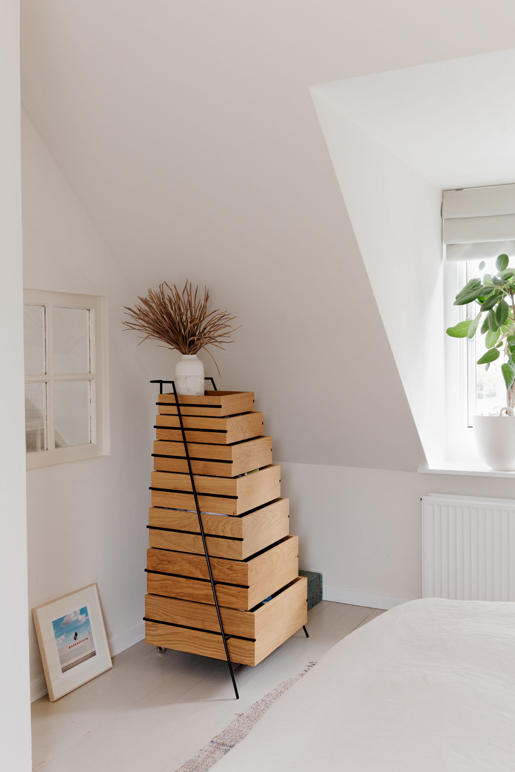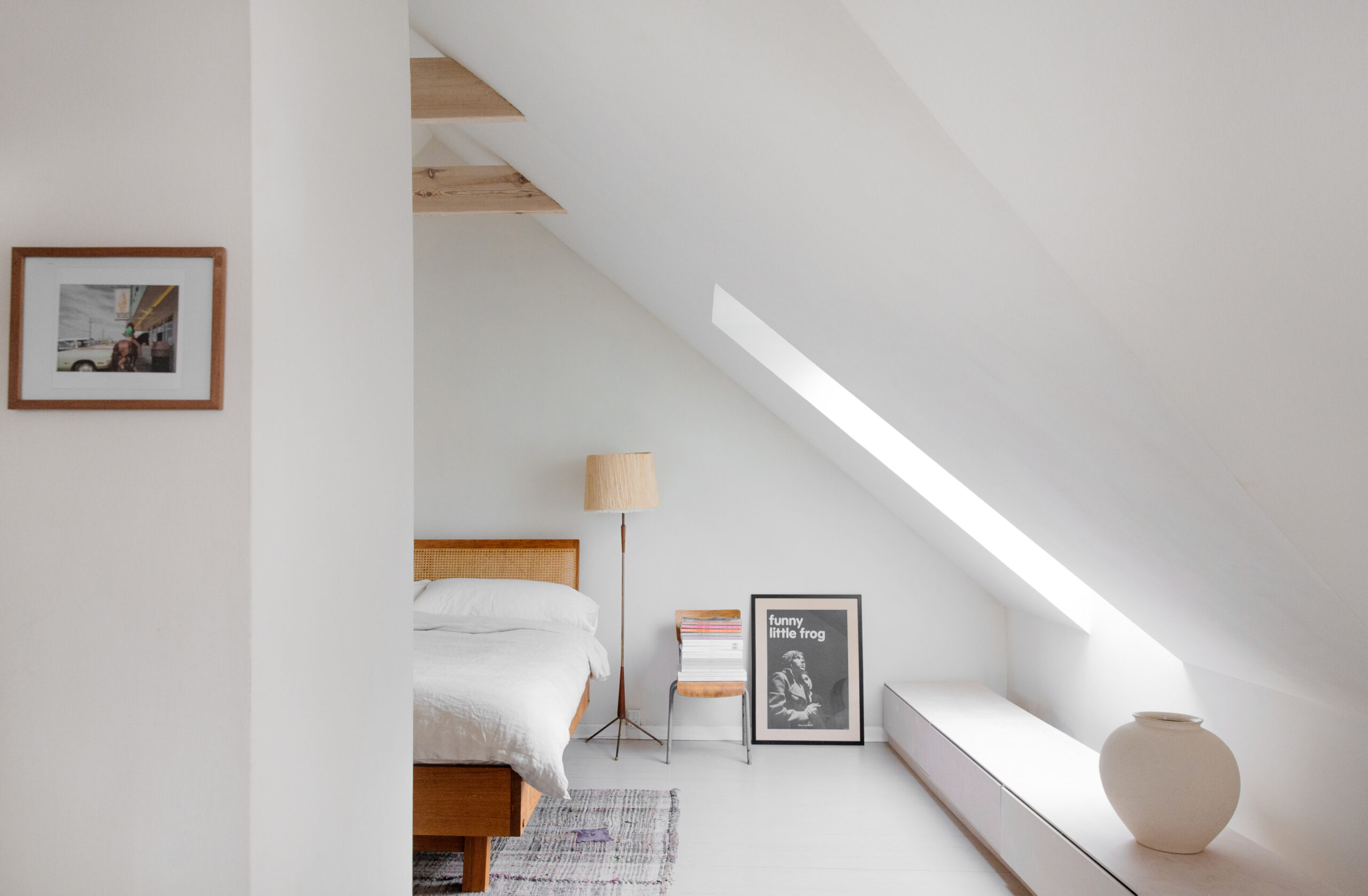 On not having a bedroom door: When we moved in, the bedroom door was so poorly made, we ripped it out, thinking we’d put in a much nicer one eventually. But with the sloping ceiling it’s a bit tricky to deal with. Living without a door, we liked the light coming through and the feeling of space. Now, we don’t want to add one.