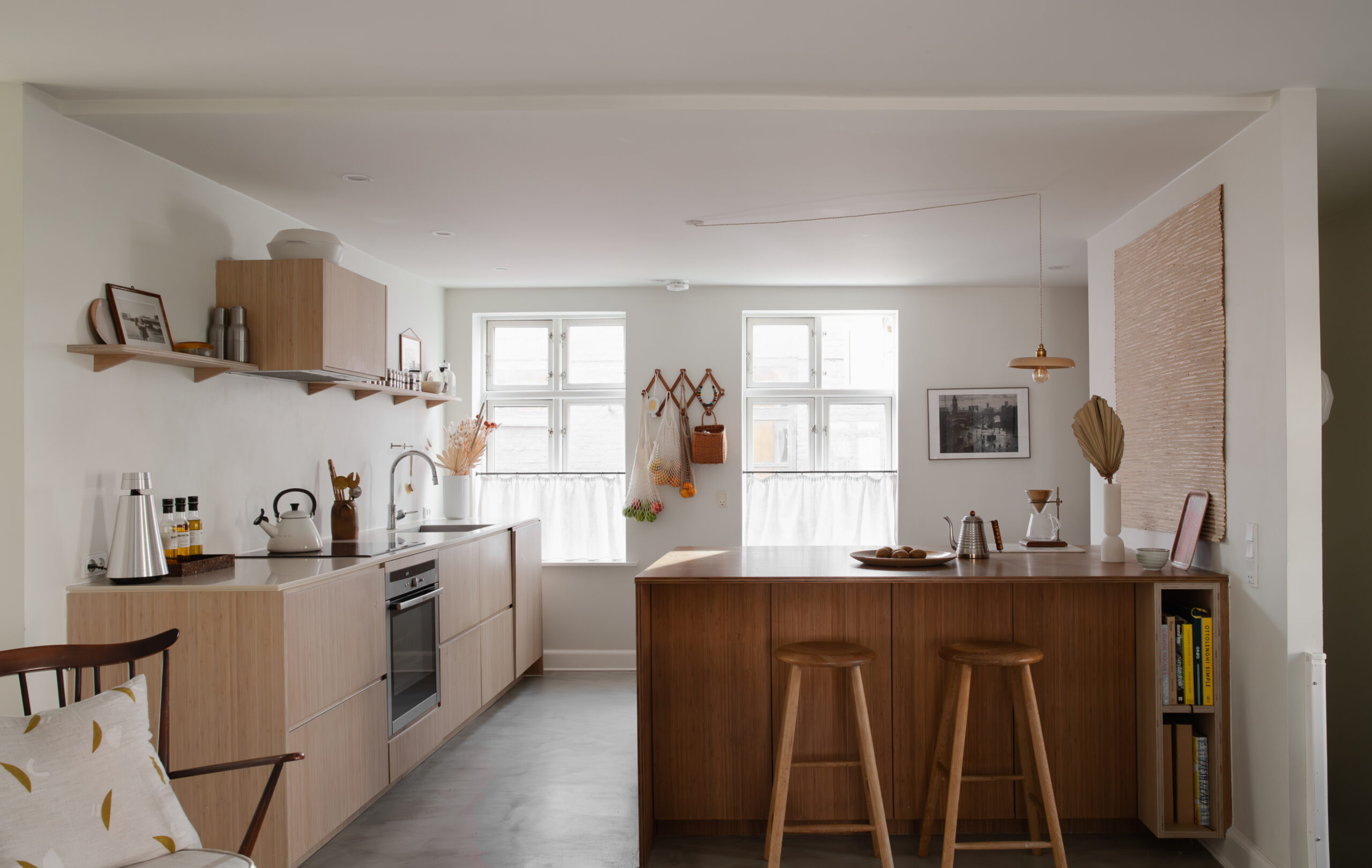 Ask og Eng, which “combines their own cabinet and drawer fronts with Ikea carcasses to keep the budget under control.” Curtains: made by Kate and hung from an aged brass pole for a more charming, cottage-style feel,” similar. Kitchen island countertop: Corian in “Sand.” Bar stools (in previous photo): Trævarefabrikernes, similar. Grasscloth panel on wall (in previous photo): Biri Tapet, similar.