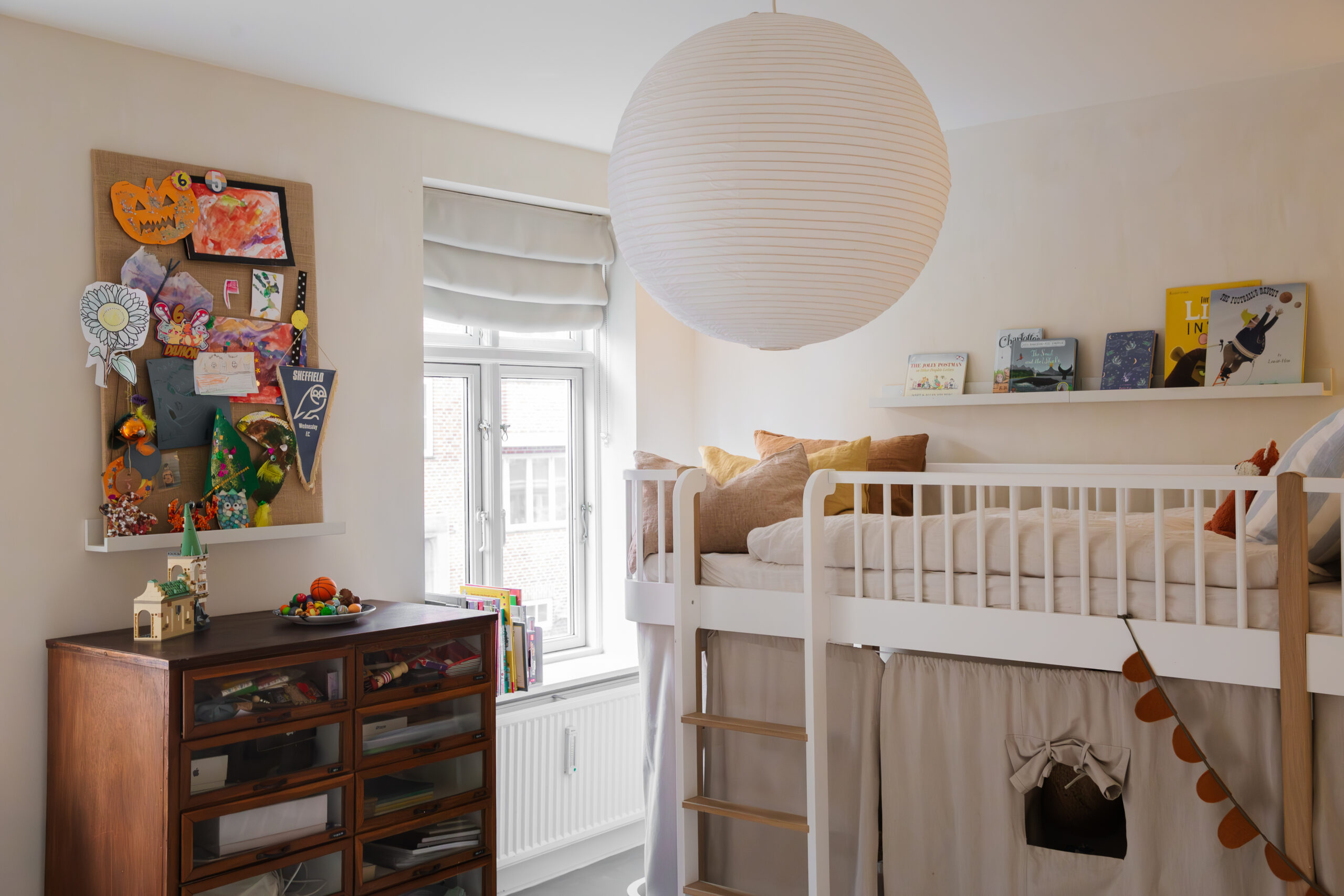Lofted bed: Oliver Furniture. Paper overhead light: Hay.