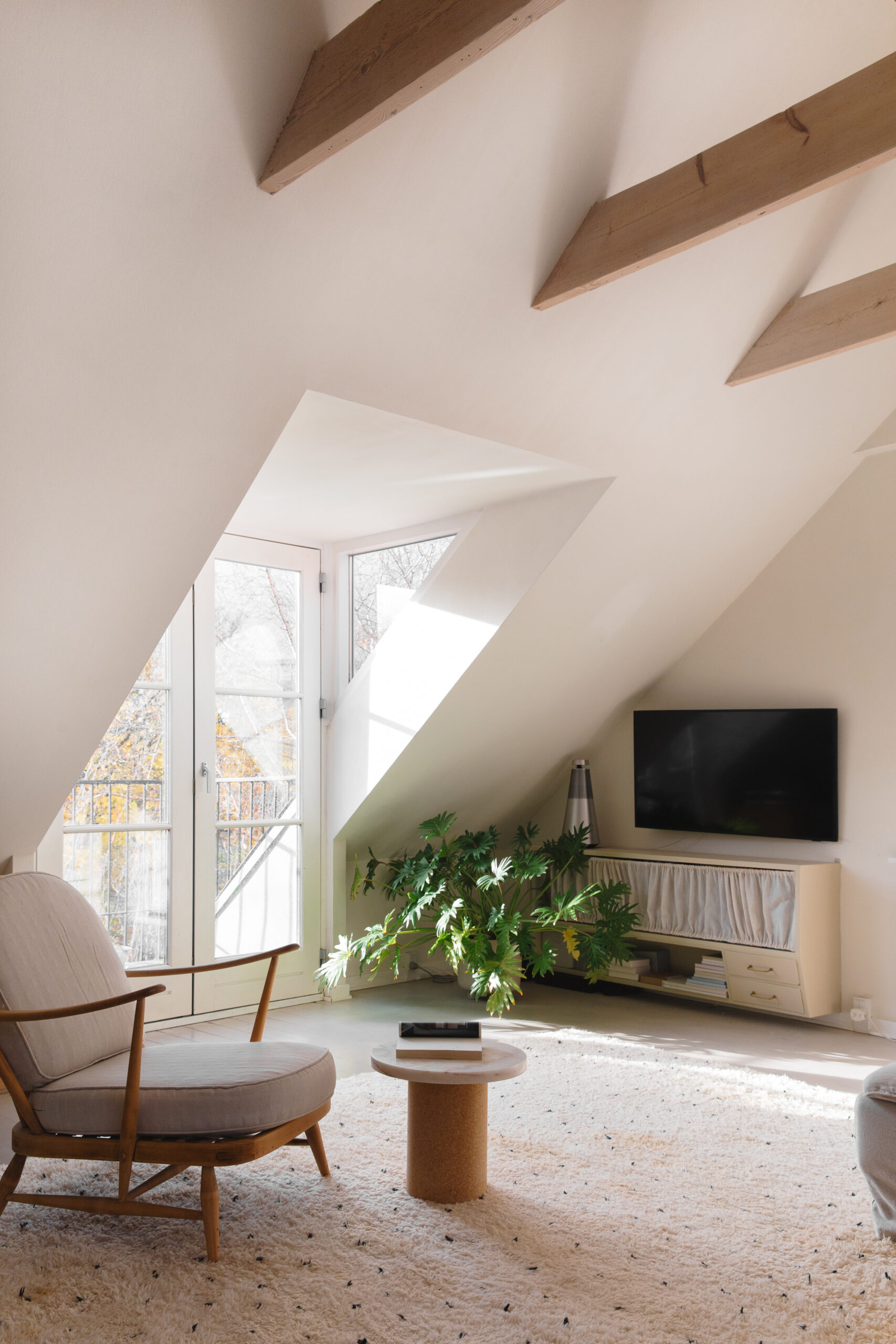 On moments of respite: We don’t spend much time upstairs during daytime, but it’s lovely and calm to come up here at the end of the day once we’ve put the kids to bed. We also have a little balcony, so in the summer we sit out there with the kids and watch the airplanes or look at the stars.
