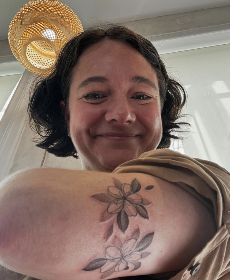 “Three years ago, we held an epic memorial for our brother, Justin. The cherry blossoms are here in D.C., where Justin and I lived for many years as adults. Second, there are cherry blossom trees at Zen Buddhist temples in Japan. Justin was a student of Buddhism. Finally, as you may know, cherry blossoms (historically in Japan) are meant to represent the fleeting and ephemeral nature of life. It felt like the universe put me in @simbalysm’s chair and care, so she could create this perfect piece of art to carry with me.” — Jeanine (above)