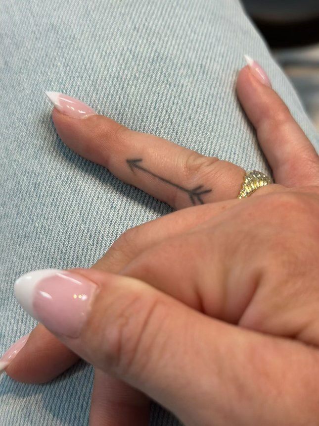 “The arrow tattoo on my ring finger is a reminder that when life gets tough, something great is usually around the corner. I think of the quote: ‘An arrow can only be shot by pulling it backwards.’” — Stacey