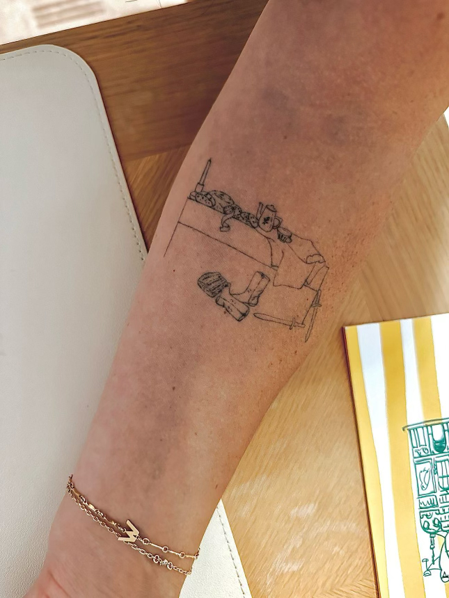 “I designed this tattoo as a still life of my family. It features my sons’ toy swords and tea set haphazardly lying around the house, alongside a messy family dinner. The boots and hat are a nod to my husband’s and my wedding song with the lyrics ‘Your boots of Spanish leather and your hat knit out of yarn.’ Every time I look down, my heart flutters at the glimpse of the life we built together.” — Hannah