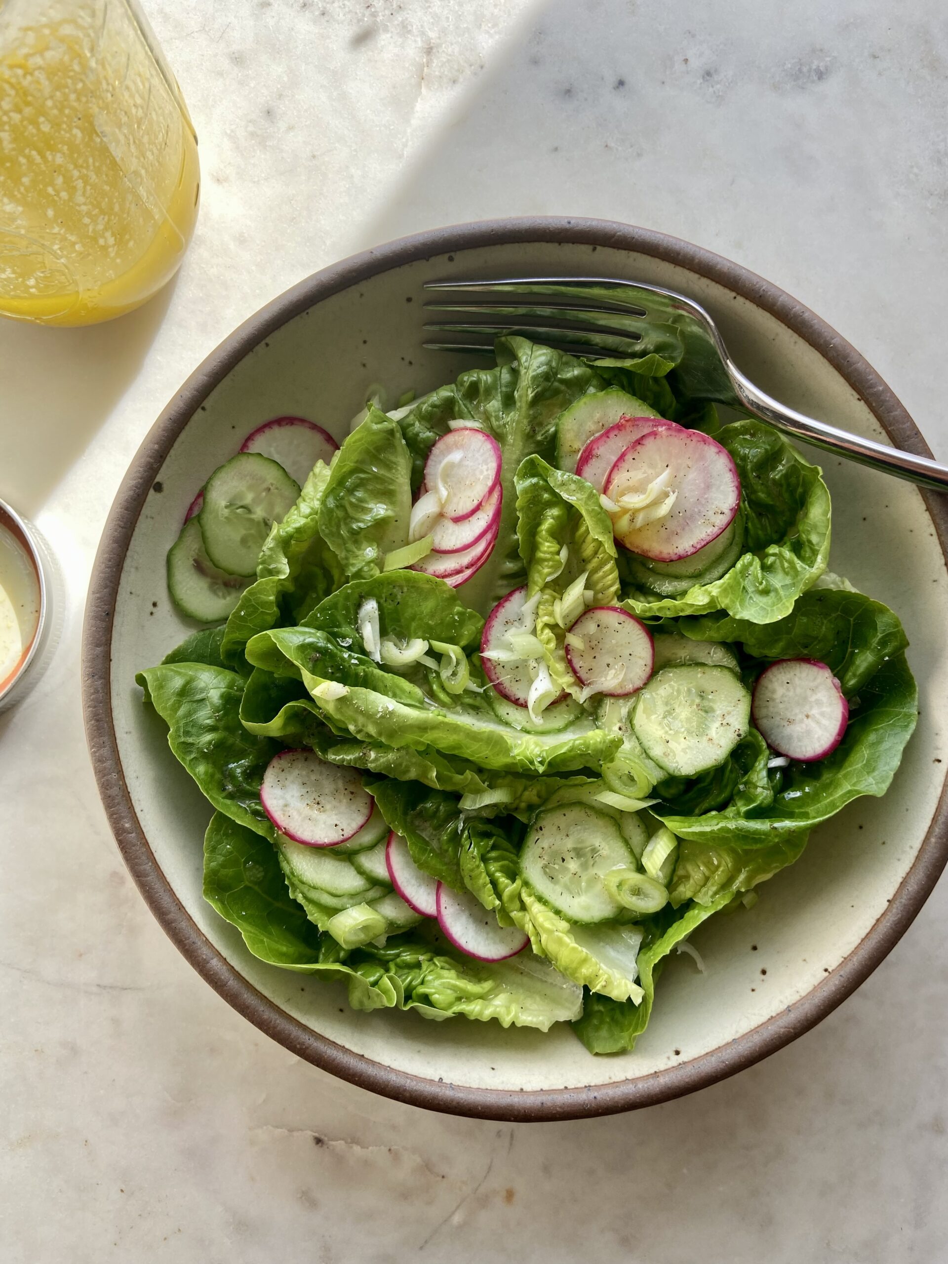 Add the lettuce, cucumbers, radishes, and scallions to a deep salad bowl and season with salt and pepper. Drizzle about half the dressing around the edges of the bowl so it sinks to the bottom and mostly avoids the lettuce. Using salad tongs, toss the salad gently, scraping the dressing up from the bottom of the bowl to distribute. Add more dressing as necessary until the lettuce is lightly dressed.