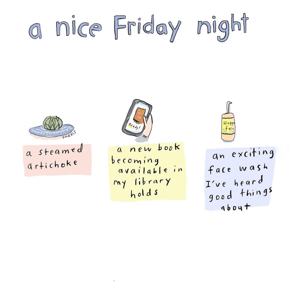 I grew up in Northern California and we ate artichokes all the time! For my Friday night, I’d add a home made craft cocktail, taking off my bra as soon as I get home, and my comfy slippers!