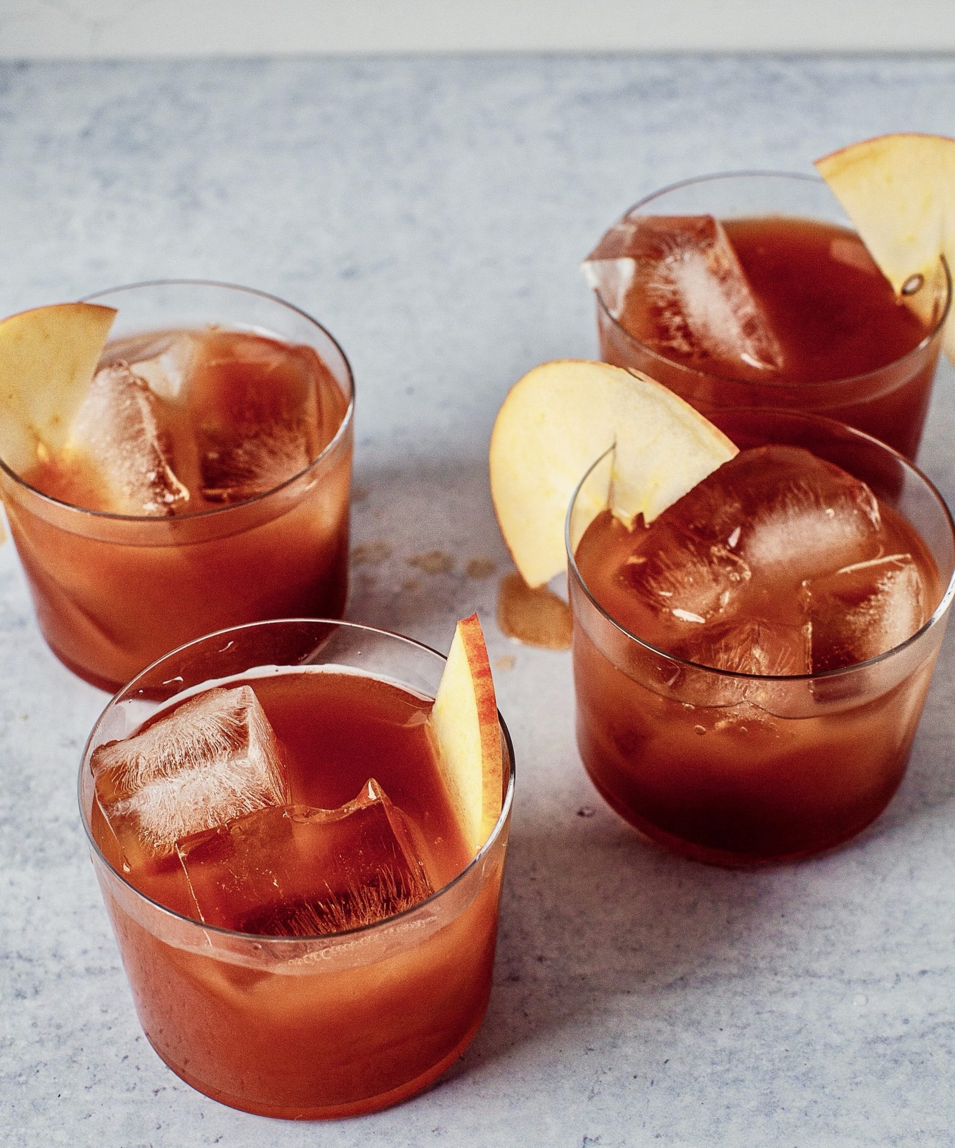 To serve: Place one large or a few smaller ice cubes in an Old-Fashioned glass (6 ounces). If the apple cider has settled in the carafe, give it another stir, and pour it over the ice. Garnish with an apple slice, if using, and toast to the new season.