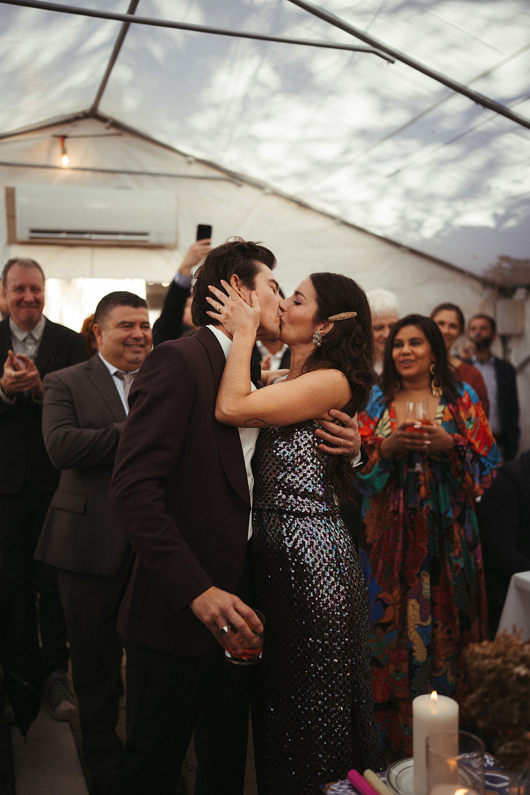 “Our wedding wasn’t super traditional, but there were two things we wanted to do: the breaking of the glass and the lighting of a unity candle. When we finally kissed, everyone clapped and cheered.”