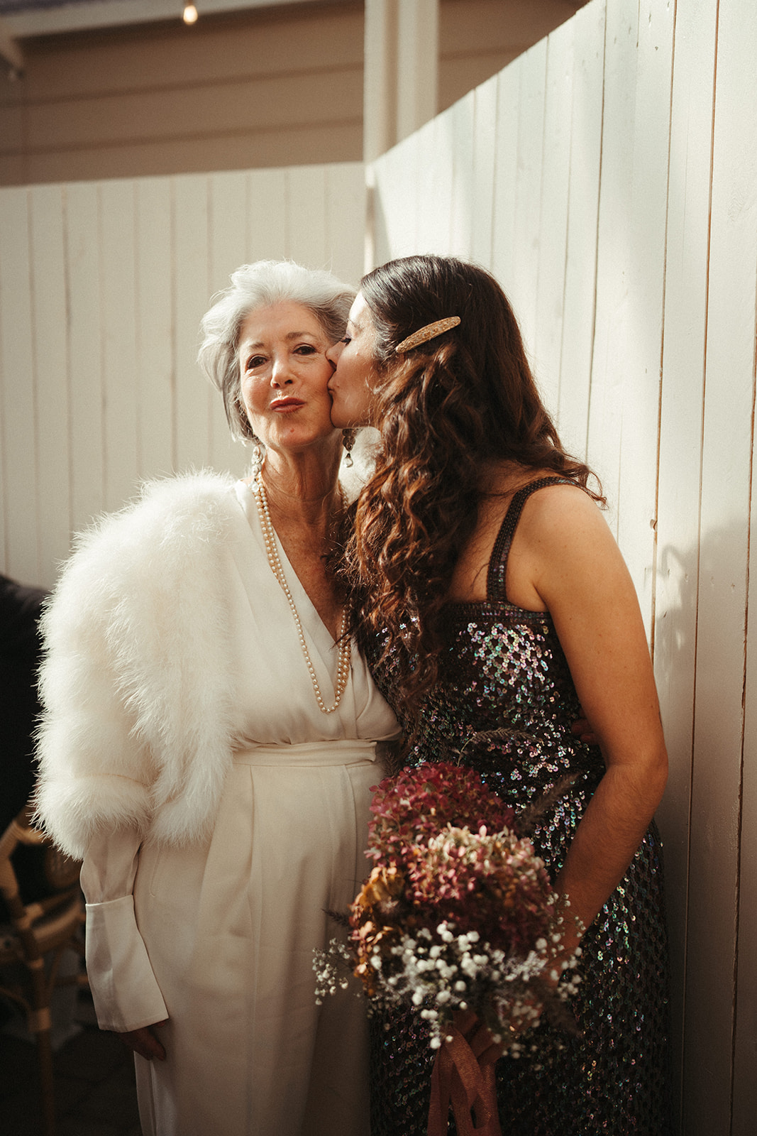 “I went to Cha Cha Linda for a vintage dress. I wanted to shine and didn’t care about wearing white. This sequined 1970s disco dress was perfect. Since my mom doesn’t live in New York, she wasn’t able to come dress shopping with me, and she felt a twinge of sadness about that. So, when she next came to visit, we went back to Cha Cha Linda to find her an outfit, which she’s wearing here. I was like, ‘Someone has to wear white!’ She looked fabulous.”