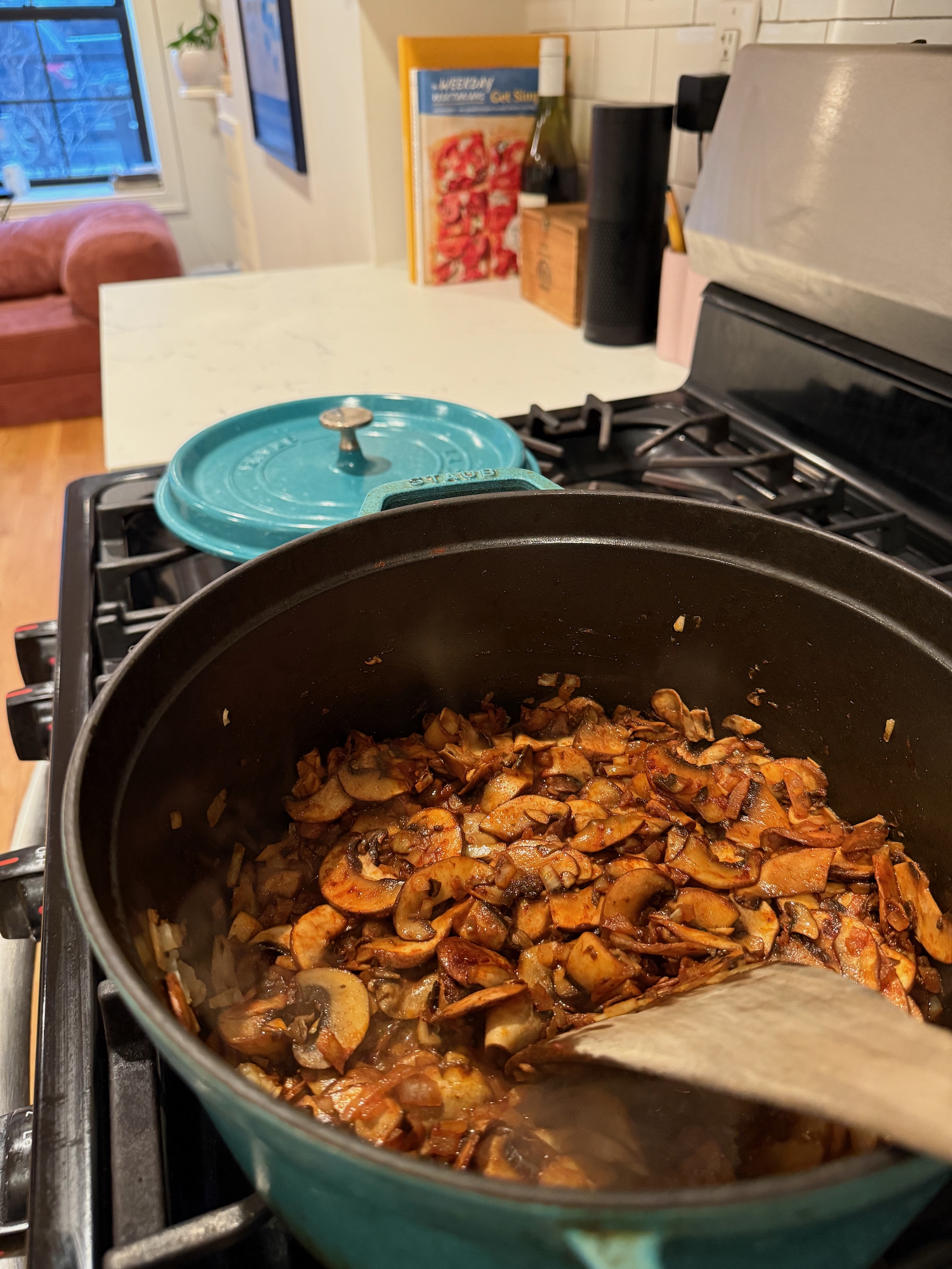 Once the mushrooms are nice and soft, take the pan off the heat and give it a quick taste. “I sometimes add a little salt here, if it needs it, but only after everything’s cooked,” Monika says. FYI, this is another key to the recipe. I’ve accidentally added the salt too early before, and noticed that the mushrooms don’t release as much liquid — a major flavor element.