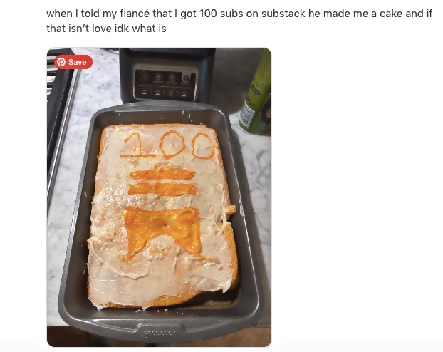 Isn’t that the sweetest gesture? I love the idea that the writer’s fiancé noticed how much reaching the milestone of 100 subscribers meant to her, and how he celebrated it with such a personal gift.