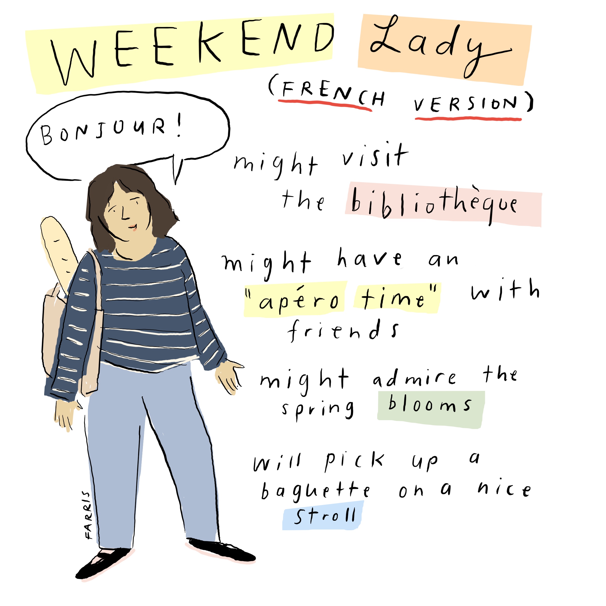 I am French and have never felt more seen. This is literally my weekend ! I go to the public library before going to the farmers’ market and buy a baguette on my way back. And I have an apéro at my place with friends too!